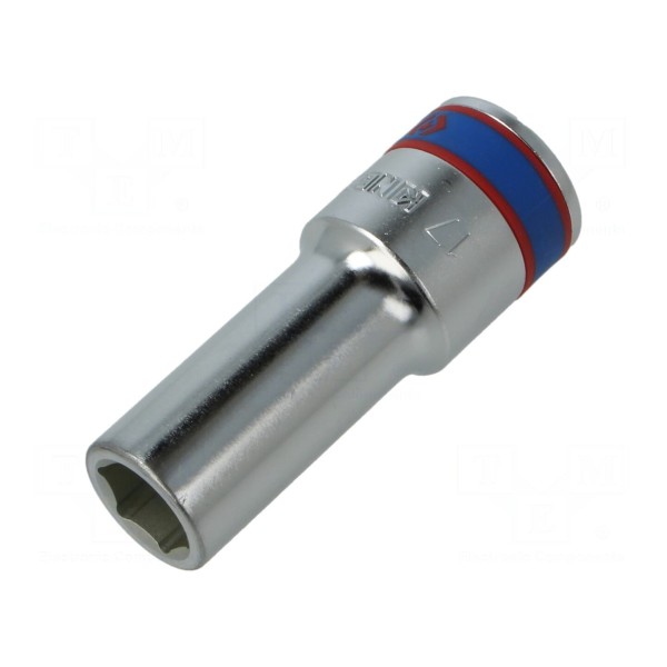 Nasadka KING TONY o rozmiarze 17 mm stanowi element osprzętu warsztatowego przystosowany do współpracy z uchwytami o rozmiarze 3/4 cala. Wersja długa o całkowitej długości 90 mm umożliwia dostęp do śrub w miejscach o ograniczonej przestrzeni oraz obsługę połączeń gwintowych osadzonych głębiej.
