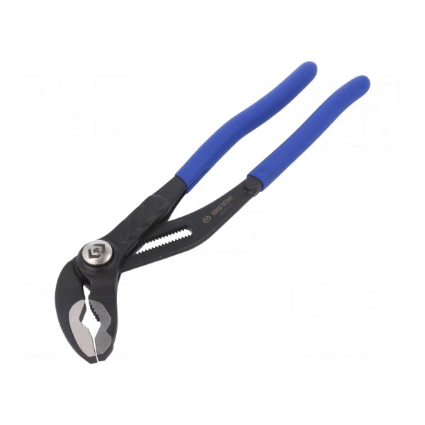 Rękojeści szczypiec pokryto warstwą tworzywa PVC, co zapewnia pewny chwyt podczas użytkowania. Produkt ten znajduje zastosowanie w pracach montażowych, serwisowych oraz instalacyjnych wymagających stabilnego trzymania obiektów o zmiennych wymiarach.