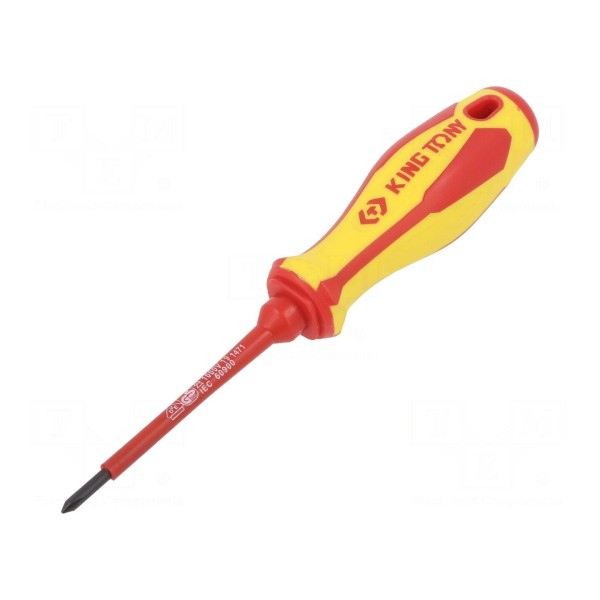Wkrętak izolowany marki KING TONY został zaprojektowany do prac z elementami wyposażonymi w gniazda Phillips o rozmiarze PH0. Narzędzie posiada grot o długości 75 mm, co pozwala na dostęp do śrub w miejscach o ograniczonym polu manewru.