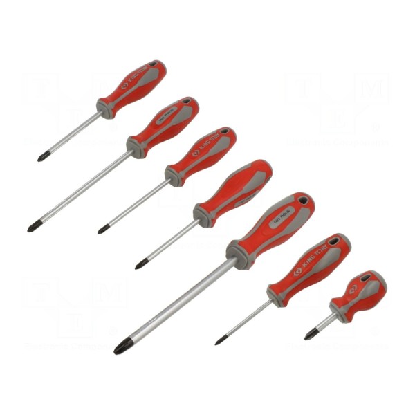 Zestaw zawiera siedem uniwersalnych wkrętaków z grotem typu Phillips. Komplet został zaprojektowany do prac montażowych oraz serwisowych wymagających obsługi śrub z gniazdem krzyżowym.