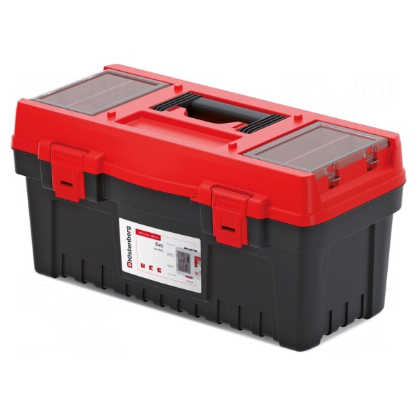 Skrzynka narzędziowa wykonana z polimeru w kolorze czarno-czerwonym. Konstrukcja zapewnia udźwig do 20kg, co pozwala na transport standardowych zestawów narzędzi ręcznych.