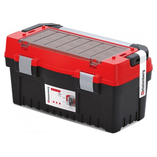 Skrzynka narzędziowa EVO55 wykonana została z polimeru w kolorystyce czarno-czerwonej. Jej konstrukcja przystosowana jest do obciążenia o masie do 20kg.