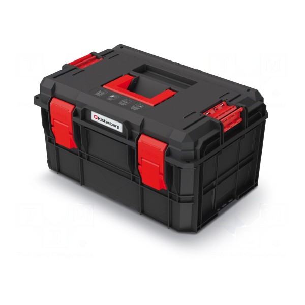 Skrzynka narzędziowa została wykonana z trwałego polimeru w kolorze czarnym, zapewniając ochronę przechowywanych przedmiotów zgodnie z klasą szczelności IP55. Wymiary zewnętrzne produktu wynoszą 546x380x307mm, co pozwala na organizację różnego rodzaju narzędzi w warunkach warsztatowych i terenowych.