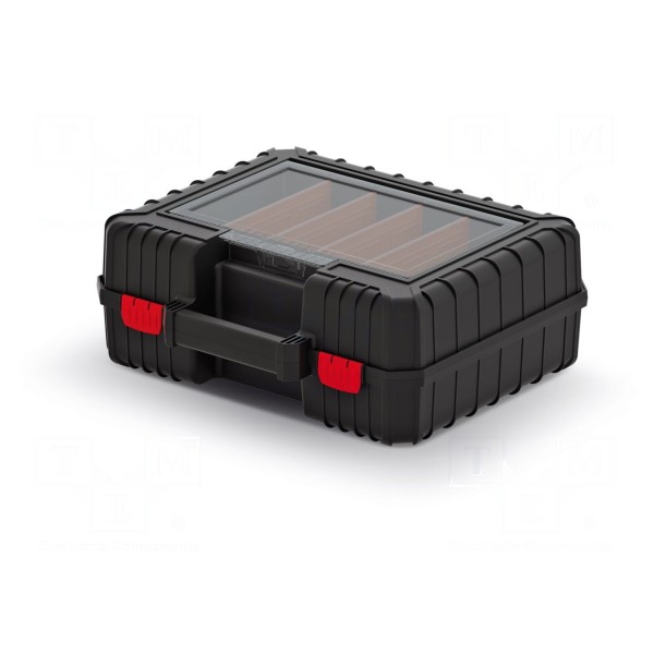 Walizka narzędziowa wykonana z polimeru w kolorze czarnym, przeznaczona do przechowywania i transportu osprzętu. Konstrukcja posiada pokrywę z poliwęglanu oraz wbudowane cztery przegrody w pokrywie, co pozwala na organizację drobnych elementów.