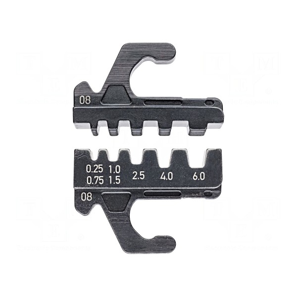 Produkt stanowi wymienne szczęki przeznaczone do procesu zaciskania końcówek tulejkowych. Element ten służy jako część zamienna w dedykowanych narzędziach do obróbki końcówek przewodów.