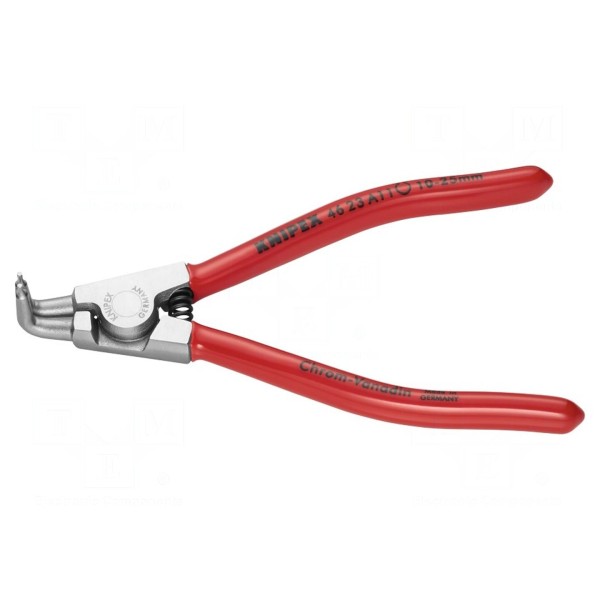 Szczypce KNIPEX przeznaczone są do obsługi zewnętrznych pierścieni osadczych o średnicy w zakresie 10–25 mm. Model ten posiada końcówki ustawione pod kątem, co ułatwia pracę w miejscach o ograniczonym dostępie. Narzędzie zostało wykonane zgodnie z normą DIN ISO 5254.