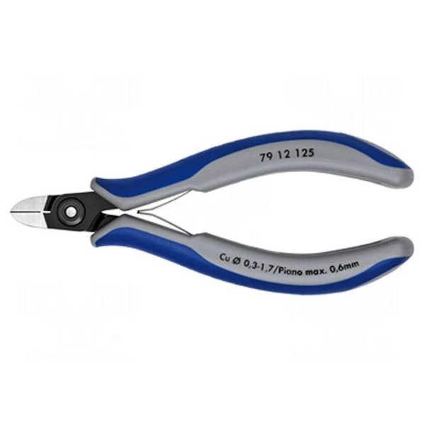 Szczypce boczne KNIPEX 7912125 przeznaczone są do precyzyjnego cięcia drobnych elementów. Narzędzie wykonane zostało ze stali chromowo-wanadowej, co zapewnia trwałość konstrukcji. Główka posiada owalny kształt oraz ostrza hartowane indukcyjnie, które osiągają twardość na poziomie około 64 HRC. Prezentowany model charakteryzuje się matowym wykończeniem oraz rodzajem cięcia z małą fazą.