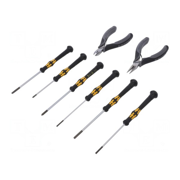 Zestaw narzędzi ogólnego stosowania w wersji ESD przeznaczony jest do prac przy elektronice. Komplet składa się z 8 elementów, w tym szczypiec do chwytania, szczypiec do cięcia bocznego oraz wkrętaków.