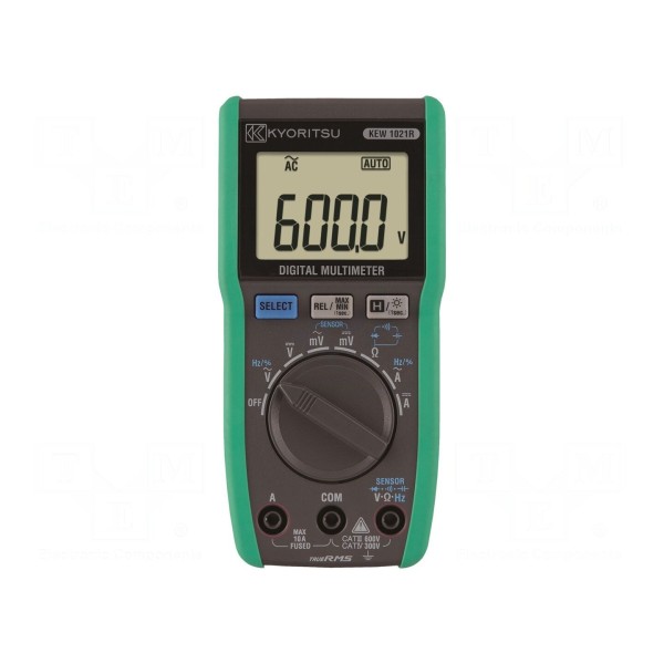 Multimetr cyfrowy KEW1021R umożliwia pomiar napięcia DC i AC w zakresach do 600V oraz prądu AC i DC w zakresach 6A i 10A. Przyrząd obsługuje pomiary ciągłości obwodu z sygnalizacją akustyczną poniżej 90Ω, rezystancji do 40MΩ, pojemności do 1mF oraz częstotliwości do 99,99kHz. Urządzenie wyposażone jest w funkcję pomiaru rzeczywistej wartości skutecznej True RMS oraz test diody przy napięciu 3V. Współczynnik wypełnienia wynosi od 1% do 99,9%.