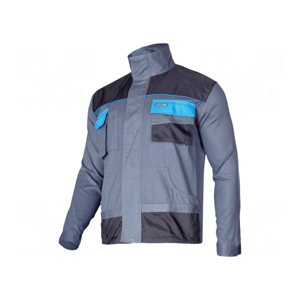 Bluza robocza marki LAHTI PRO wykonana jest z bawełny o gramaturze 190g/m². Model w kolorze szaro-niebieskim charakteryzuje się konstrukcją rozpinaną, co ułatwia zakładanie i zdejmowanie odzieży w trakcie pracy.