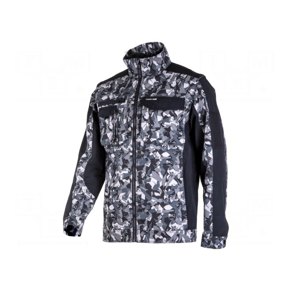 Bluza w rozmiarze XL została wykonana z połączenia bawełny oraz poliestru o gramaturze 240g/m². Produkt charakteryzuje się rozpinaną konstrukcją oraz możliwością odpinania rękawów, co pozwala na dostosowanie odzieży do aktualnych warunków pracy. Utrzymana jest w kolorystyce moro oraz szaro-czarnej.