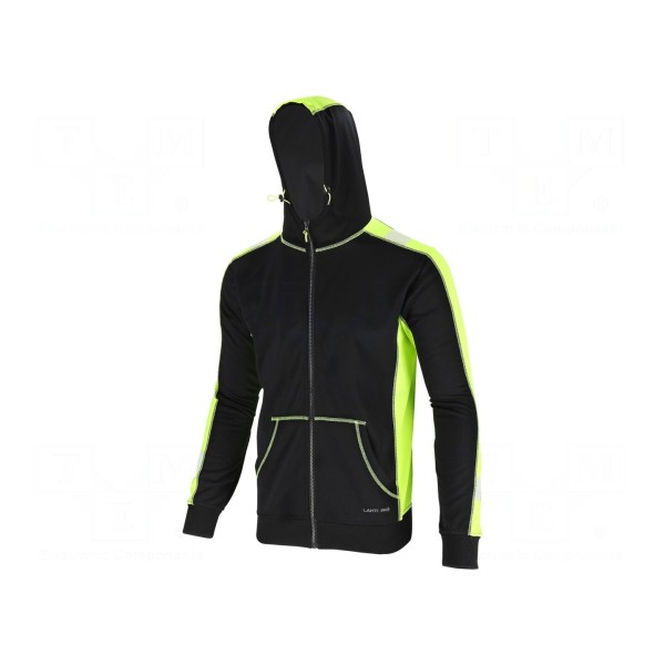 Bluza z kapturem w wersji ostrzegawczej została wykonana z poliestru o gramaturze 260g/m². Produkt utrzymany jest w kolorystyce czarno-żółtej, co zwiększa widoczność użytkownika w miejscu pracy.