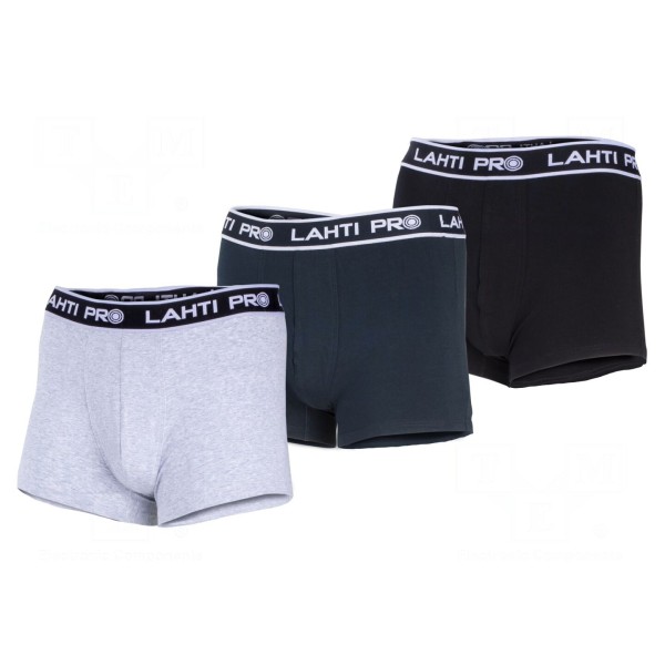 Bokserki LAHTI PRO wykonane są z mieszanki bawełny oraz elastanu, co zapewnia dopasowanie do sylwetki użytkownika. Produkt dostępny jest w zestawie zawierającym trzy sztuki w kolorach: czarnym, granatowym oraz szarym.