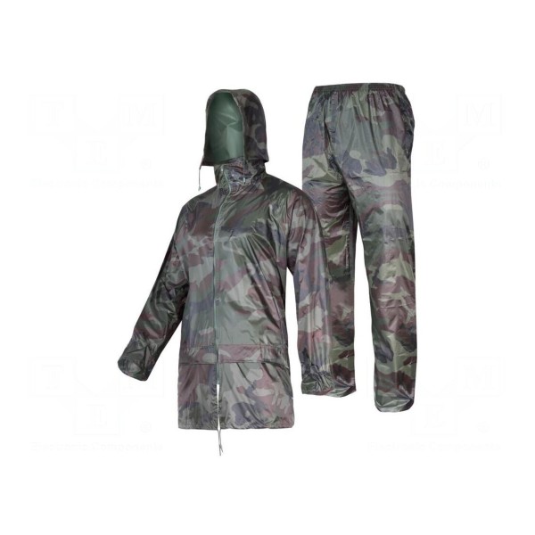 Komplet przeciwdeszczowy marki Lahti Pro to odzież ochronna w rozmiarze XXL, wykonana z połączenia poliestru oraz PVC. Odzież posiada wzór moro i spełnia wymagania normy CE.
