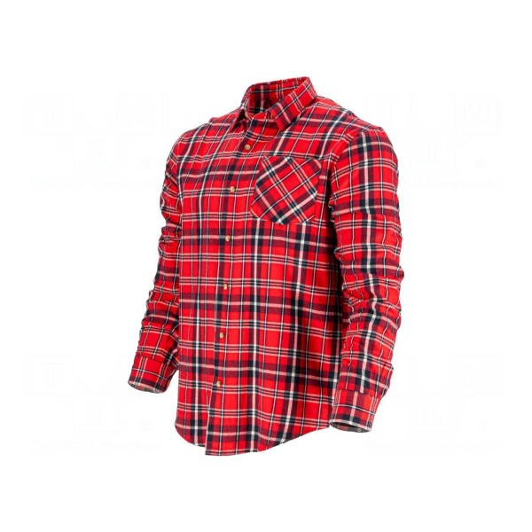 Koszula flanelowa ocieplana wykonana została z bawełny o gramaturze 170g/m². Produkt dostępny jest w rozmiarze S oraz w kolorystyce czerwono-granatowej.