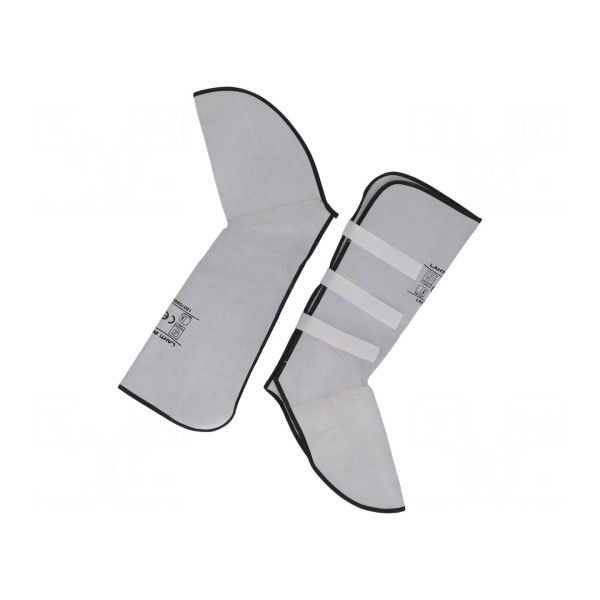 Konstrukcja elementu BHP posiada regulowany system mocowania, umożliwiający dopasowanie do obwodu nogi użytkownika. Produkt jest zgodny z normą CE oraz EN ISO 11611, co określa jego parametry ochronne dla spawaczy.