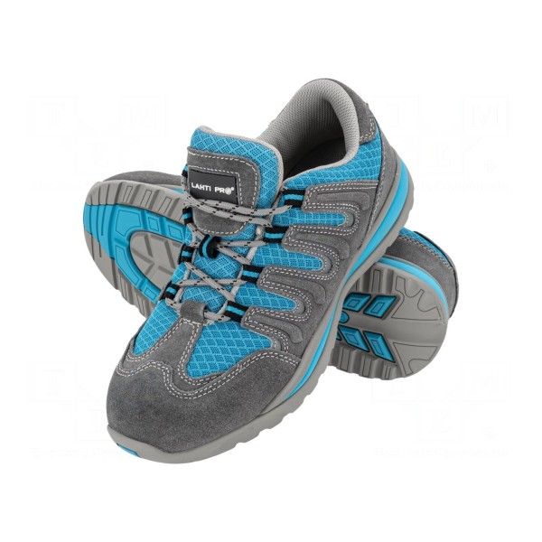 Półbuty damskie LAHTI PRO wykonane zostały z połączenia dzianiny oraz zamszu w kolorze szaro-niebieskim. Obuwie posiada metalowy podnosek, który zapewnia ochronę palców przed uderzeniami.