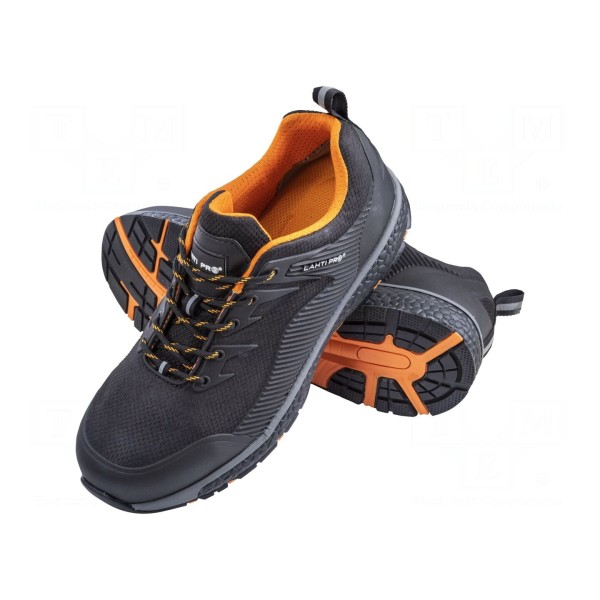 Półbuty w rozmiarze 41 zostały wykonane z połączenia dzianiny oraz KPU, co wpływa na ich konstrukcję. Obuwie posiada metalowy nosek, zwiększający ochronę przed urazami mechanicznymi. Produkt utrzymany jest w kolorystyce czarno-pomarańczowej.