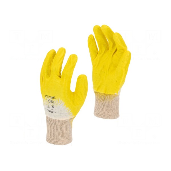 Rękawice ochronne wykonane z połączenia bawełny oraz nitrylu charakteryzują się żółto-białą kolorystyką i oferowane są w rozmiarze 8. Konstrukcja materiałowa łączy naturalne włókna z powłoką nitrylową, co wpływa na ich parametry użytkowe.