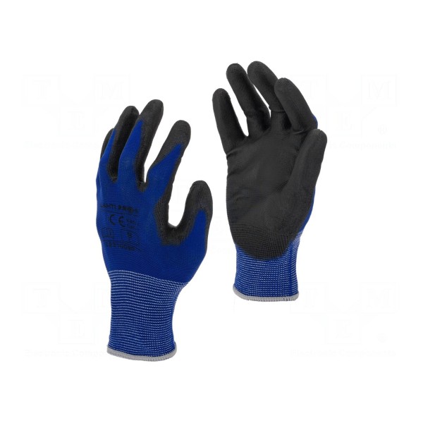 Rękawice ochronne LAHTI PRO wykonane są z połączenia tkaniny nylonowej oraz warstwy poliuretanu (PU). Model dostępny jest w kolorze niebiesko-czarnym w rozmiarze 9.