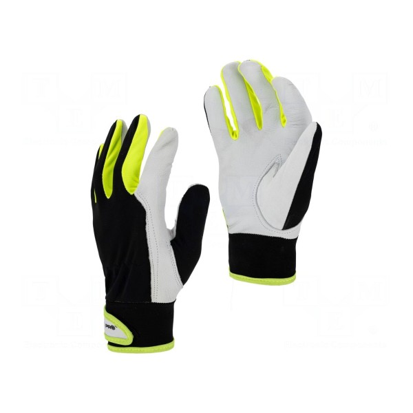 Rękawice ochronne w rozmiarze 10 wykonane zostały z połączenia bawełny, poliestru oraz skóry naturalnej. Zastosowane materiały zapewniają użytkownikowi odpowiednią ochronę podczas wykonywanych czynności. Produkt utrzymany jest w kolorystyce czarno-żółtej.