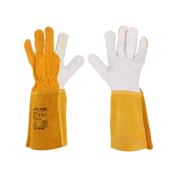 Rękawice ochronne w rozmiarze 10 wykonane zostały ze skóry naturalnej w wersji długiej. Konstrukcja oraz materiał zapewniają ochronę dłoni podczas pracy na stanowiskach spawalniczych.