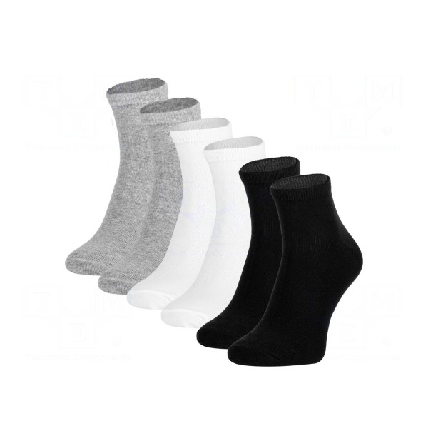 W zestawie znajdują się 3 pary skarpetek w kolorystyce obejmującej barwy białą, czarną oraz szarą.