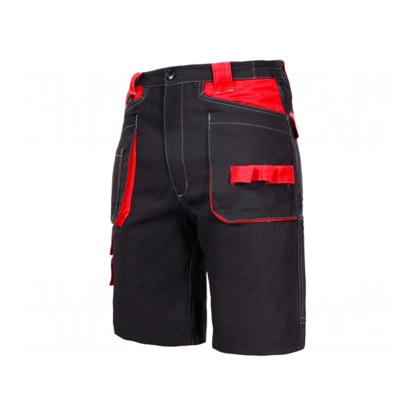 Spodenki ochronne wykonane z bawełny charakteryzują się gramaturą materiału 245g/m². Produkt dostępny jest w rozmiarze XL oraz w kolorystyce czarno-czerwonej.