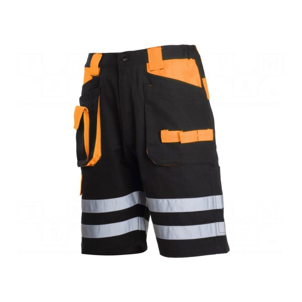 Spodenki ochronne wykonane z bawełny charakteryzują się gramaturą materiału 245g/m². Produkt utrzymany jest w kolorystyce czarno-pomarańczowej i dostępny w rozmiarze L.