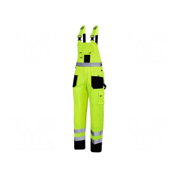 Te spodnie robocze typu ogrodniczki wykonano z połączenia bawełny oraz poliestru o gramaturze 270g/m². Produkt posiada właściwości ostrzegawcze w żółto-czarnej kolorystyce, co odpowiada 2 klasie wykonania.
