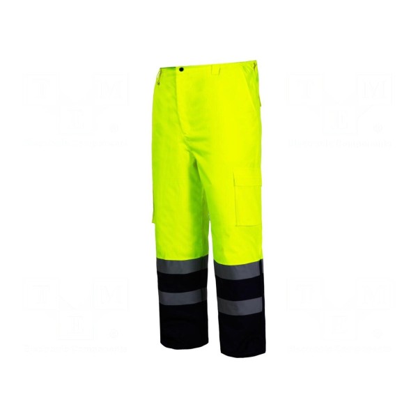 Model w kolorze żółtym wyposażono w sześć kieszeni, które umożliwiają przechowywanie niezbędnych narzędzi lub przedmiotów. Dzięki swojej konstrukcji i właściwościom ocieplającym spodnie przystosowane są do pracy w niskich temperaturach, zachowując parametry ochronne typowe dla odzieży ostrzegawczej.