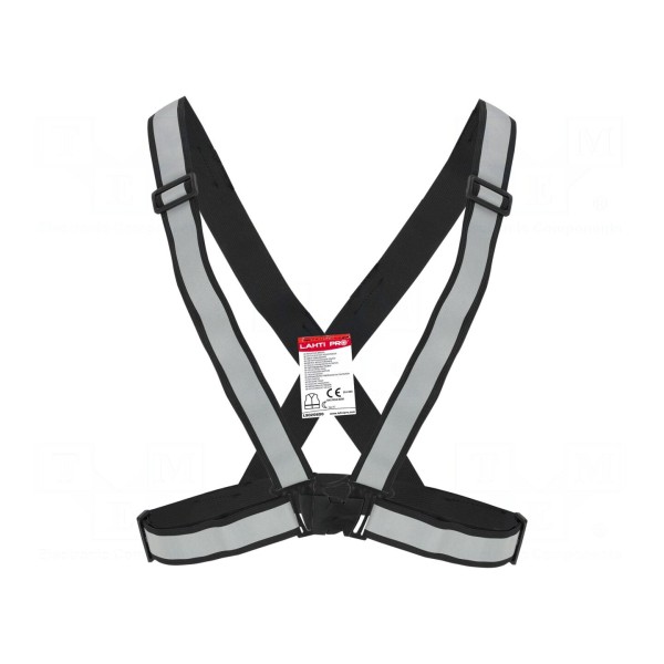 Produkt spełnia wymagania normy EN 17353:2020 typ B3 oraz posiada oznaczenie CE. Szelki utrzymane są w czarnym kolorze i pełnią funkcję ostrzegawczą.