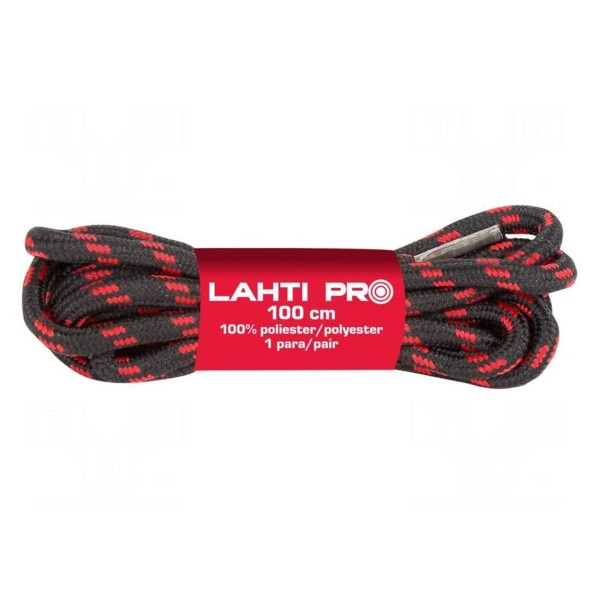 Sznurowadła wykonane z poliestru charakteryzują się okrągłym przekrojem. Produkt o długości 1 m w kolorystyce czarno-czerwonej jest przeznaczony do obuwia trekkingowego.
