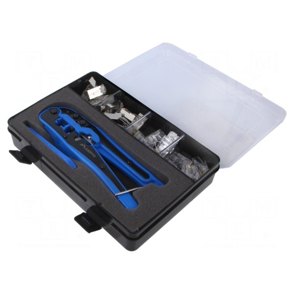 Zestaw narzędzi przeznaczony jest do zaciskania końcówek na złączach typu RJ45. Komplet został zaprojektowany z myślą o pracach montażowych wymagających użycia narzędzi do obróbki zakończeń przewodów telekomunikacyjnych.