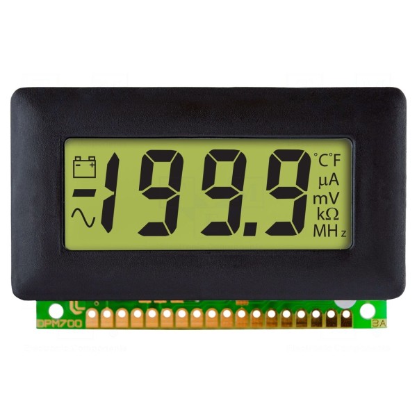Cyfrowy woltomierz montażowy LASCAR DPM 700 przeznaczony jest do pomiaru napięcia stałego w zakresie od 0 do 200mV. Przyrząd charakteryzuje się dokładnością pomiaru na poziomie ±(0,05% + 1 cyfra) oraz częstotliwością próbkowania wynoszącą 3 pomiary na sekundę. Urządzenie zostało wyposażone w czytelny wyświetlacz LED o wysokości znaku 12,7mm, prezentujący dane w formacie 3,5 cyfry.