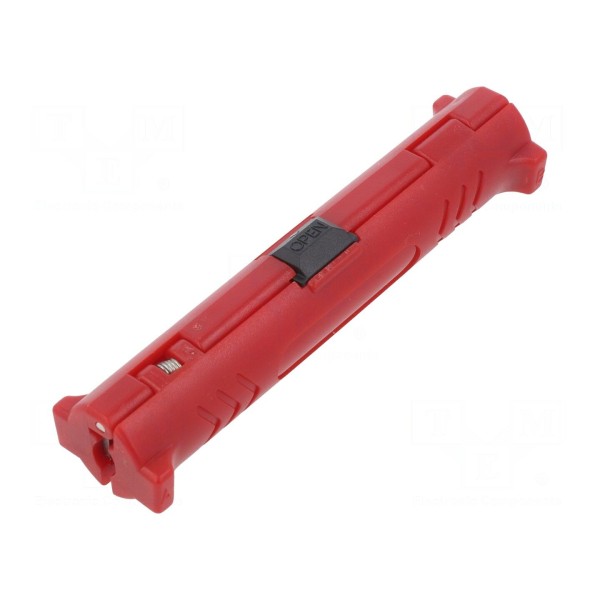 Ściągacz izolacji przeznaczony jest do obróbki przewodów koncentrycznych. Narzędzie umożliwia pracę z kablami o średnicy zewnętrznej w zakresie od 4,8 mm do 7,6 mm.