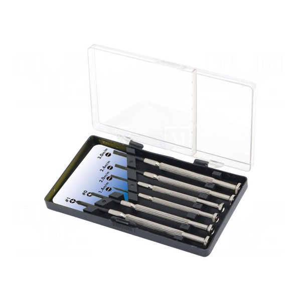 Zestaw zawiera sześć wkrętaków o konstrukcji precyzyjnej, przeznaczonych do prac montażowych i serwisowych wymagających wysokiej dokładności. W komplecie znajdują się narzędzia z grotami typu Phillips oraz płaskimi (SL).