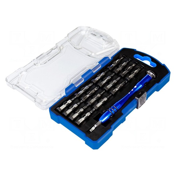 Całość przechowywana jest w kasecie wykonanej z tworzywa sztucznego, która ułatwia organizację i przechowywanie poszczególnych części zestawu. W zestawie: końcówki wkrętakowe, rękojeść wkrętakowa.