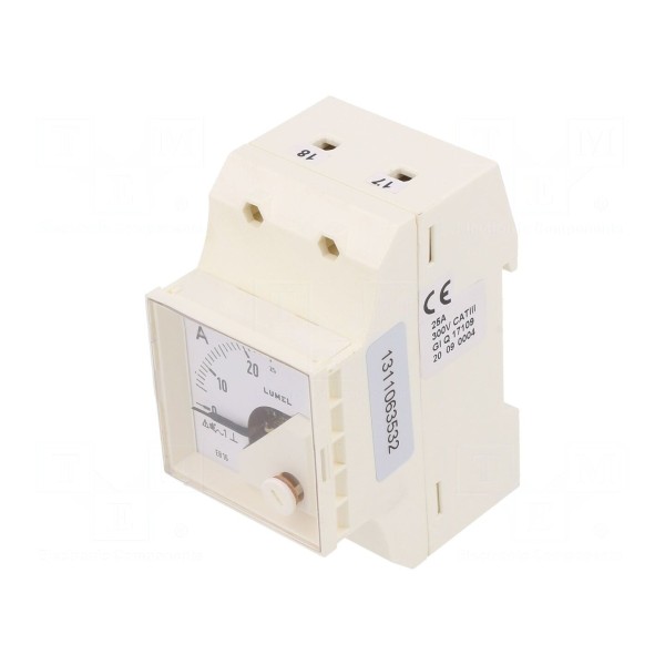 Amperomierz analogowy przeznaczony do bezpośredniego pomiaru prądu przemiennego w zakresie od 0 do 25A. Urządzenie charakteryzuje się obsługą wartości True RMS oraz pracuje w zakresie częstotliwości od 40 do 72Hz. Klasa dokładności miernika wynosi 1,5, co zapewnia precyzyjny odczyt mierzonych parametrów elektrycznych.