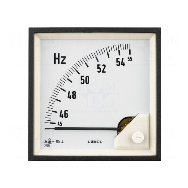 Miernik analogowy częstotliwości przeznaczony do montażu tablicowego. Urządzenie obsługuje zakres pomiarowy od 45 do 55Hz przy napięciu znamionowym 0,23kV i napięciu maksymalnym 0,6kV. Klasa dokładności przyrządu wynosi 0,5, co zapewnia precyzyjny odczyt parametrów sieci w aplikacjach przemysłowych.