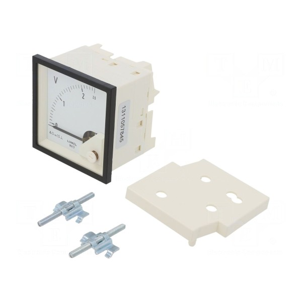 Woltomierz analogowy przeznaczony do montażu panelowego służy do pomiaru napięcia stałego w zakresie od 0 do 2,5V. Urządzenie charakteryzuje się klasą dokładności 1,5 oraz maksymalnym dopuszczalnym napięciem roboczym wynoszącym 600V (0,6kV).