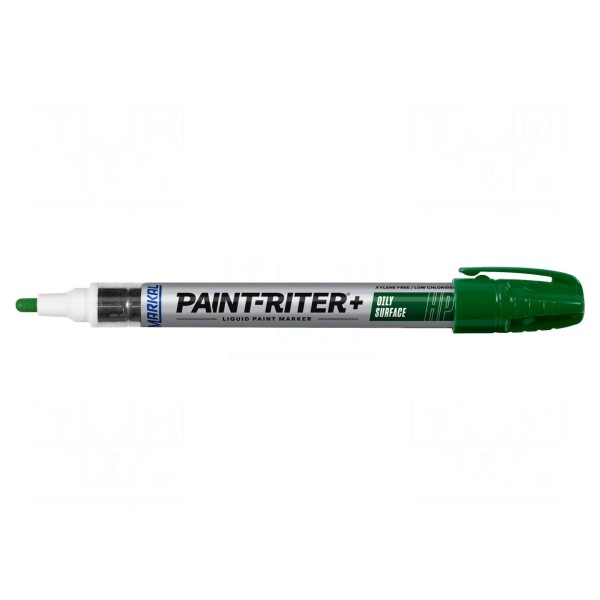 Pisak z ciekłą farbą PAINTRITER+ HP w kolorze zielonym wyposażony jest w okrągłą końcówkę. Metalowy korpus zapewnia odpowiednią wytrzymałość narzędzia podczas eksploatacji w warunkach przemysłowych. Preparat charakteryzuje się brakiem zawartości ksylenu.