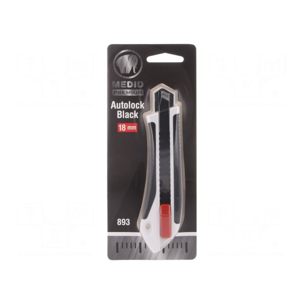 Nóż uniwersalny wyposażony w ostrze o szerokości 18 mm, wykonane ze stali nierdzewnej. Konstrukcja narzędzia obejmuje rękojeść z bimetalu oraz mechanizm blokady ostrza, który umożliwia stabilizację w wybranej pozycji podczas pracy.