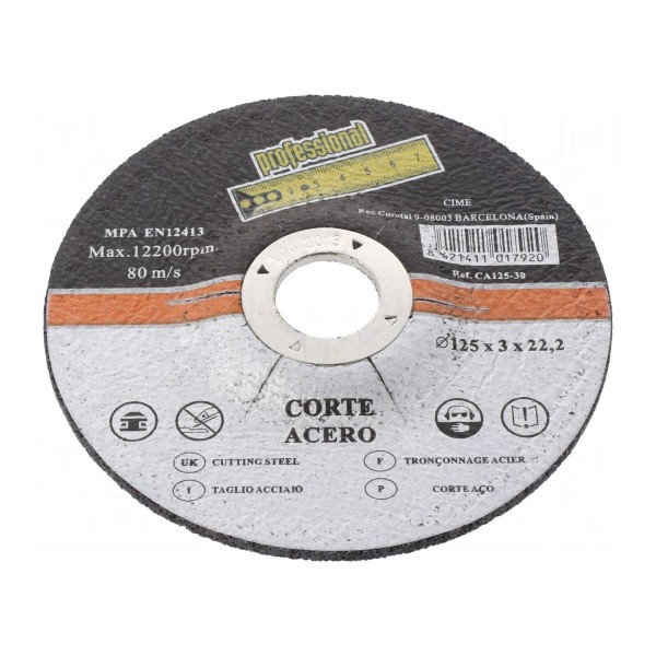 Tarcza tnąca o średnicy zewnętrznej 125 mm i grubości 3 mm przeznaczona jest do obróbki materiałów takich jak metal oraz stal. Produkt wyposażony jest w otwór montażowy o średnicy 22 mm.