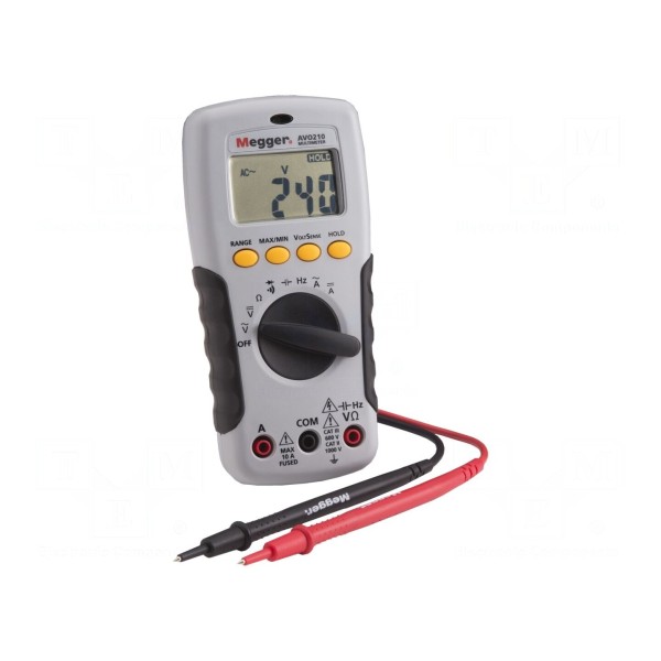 Multimetr cyfrowy Megger AVO210 to urządzenie przeznaczone do pomiarów napięcia AC i DC, prądu AC i DC, rezystancji, pojemności oraz częstotliwości. Przyrząd obsługuje zakres napięcia stałego do 1kV z dokładnością ±(0,5% + 2 digit) oraz napięcia przemiennego do 750V z dokładnością ±(1,5% + 5 digit). Pomiar prądu możliwy jest w zakresach 2A oraz 10A, przy czym szerokość pasma dla pomiarów AC wynosi od 50Hz do 500Hz. Częstotliwość mierzona jest w przedziale od 200Hz do 20MHz z dokładnością ±(0,01% + 1 digit), a pojemność w zakresie od 2nF do 2mF.