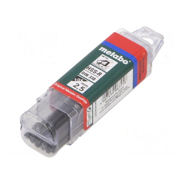 Wiertło do metalu o średnicy 2,5 mm wykonane jest ze stali szybkotnącej walcowanej HSS-R. Całkowita długość elementu wynosi 57 mm, przy czym długość części roboczej to 30 mm. Narzędzie zostało wyprodukowane zgodnie z normą DIN 338.