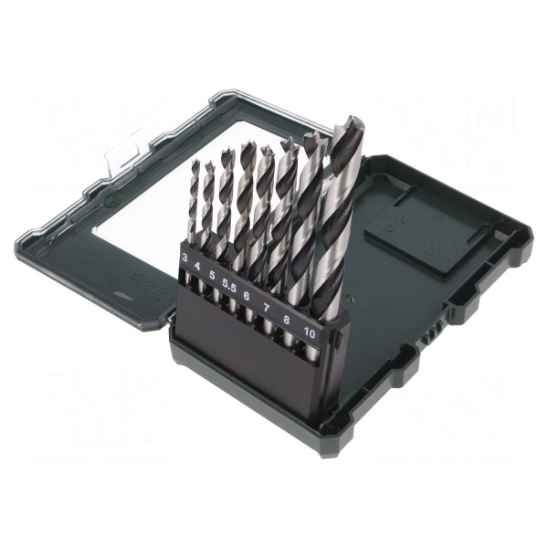 W skład kompletu wchodzą wiertła o średnicach 3mm, 4mm, 5mm, 5,5mm, 6mm, 7mm, 8mm oraz 10mm. Akcesoria są kompatybilne z elektronarzędziami obsługującymi ten typ osprzętu wiertarskiego.