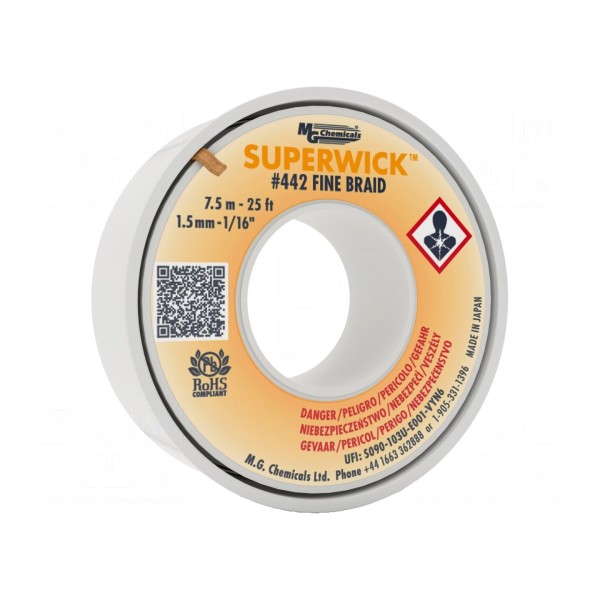 Taśma o szerokości 1,5mm i długości 7,5m jest fabrycznie nasączona topnikiem typu RMA (ROL0), który jest bezhalogenkowy i kalafoniowy. Pozostałości po użyciu topnika są niekorozyjne, co eliminuje konieczność ich usuwania po zakończeniu prac.