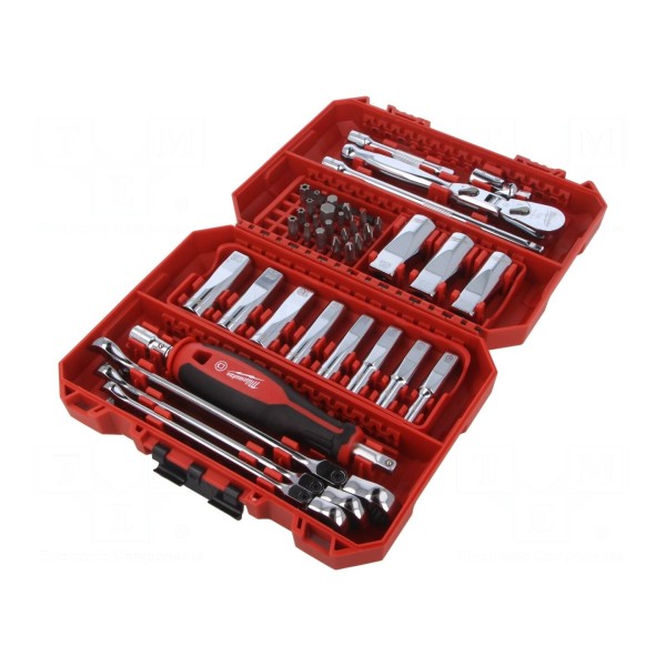 W zestawie: grzechotka, końcówki nasadowe, końcówki wkrętakowe, przedłużka, przegub Cardana, rękojeść wkrętakowa. Całość jest przechowywana w skrzynce narzędziowej ułatwiającej organizację i transport elementów zestawu.