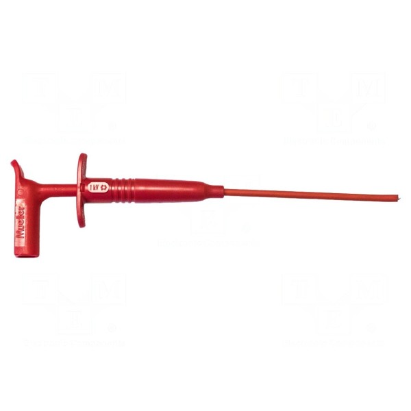 Urządzenie charakteryzuje się prądem znamionowym 1 A oraz napięciem znamionowym 1 kV. Konstrukcja spełnia wymogi bezpieczeństwa zgodnie z normą EN 61010 i kategorią pomiarową CAT III 1000 V. Element posiada obudowę w kolorze czerwonym.